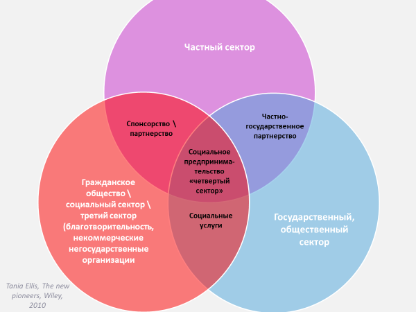 EMES (Европейская исследовательская сеть (http://www.emes.net/), подчеркивает, что социальное предпринимательство является гибридом, появляющемся на пересечении государственного, частного и гражданского секторов. Его часто называют «четвертым сектором», охватывающим части остальных трех. В большинстве случаев социальное предпринимательство имеет свою отправную точку в гражданском секторе.