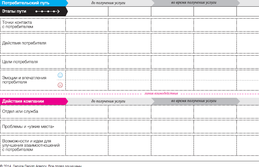 Чтобы визуализировать путешествие клиента, дизайнер может использовать инструмент Service Blueprint.