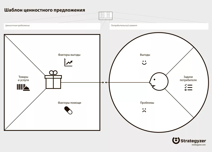 Ценностное предложение – это не лозунг и не реклама. Это описание фактических характеристик вашего продукта и сервиса в связи с реальными потребностями клиентов. Александр Остервальдер и соавторы представили шаблон ценностного предложения. Этот инструмент алгоритмизирует проектирование правильного сочетания функций продукта.