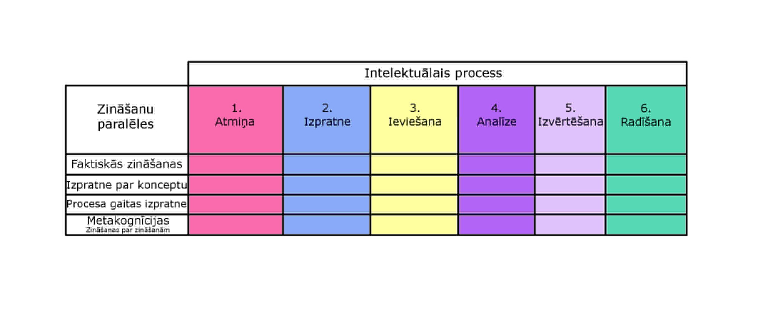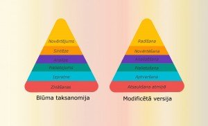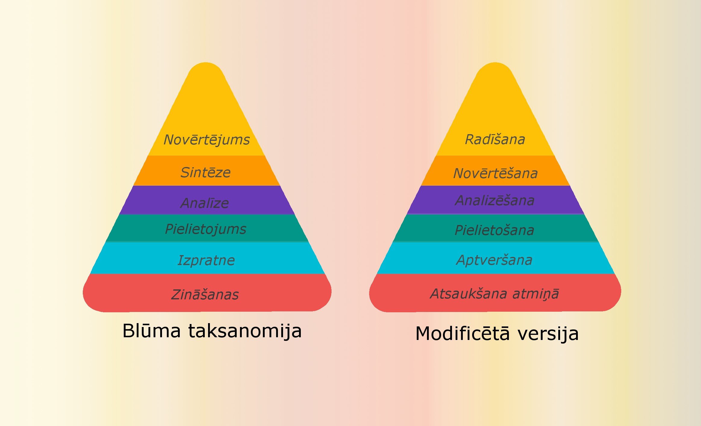 Attēls atspoguļo atjaunoto struktūru. Ērtākai salīdzināšanai blakus atjaunotajai versijai attēlota arī sākotnējā Blūma taksonomija.