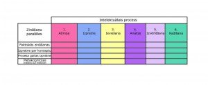| Sintēze | Spēja individuālus elemntus, daļas un blokus savienot kopumā- sistēmā. | Spēja saistīt, sapludināt, apkopot materiālus, atklāt iekšējās un starpdisciplinārās saites. | Pētniecisks darbs, portfolio, projekts. |