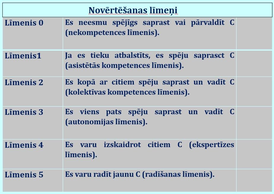 | Vērtē | Vērtību pieņemšana, nošķiršana. | Spēja izrādīt cieņu, bažas, atklāt savas spējas, izskaidrot prioritātes, morālas idejas un to saikni ar pieredzēto. | Monitorings, emuāri, prezentācijas, ziņojumi |
