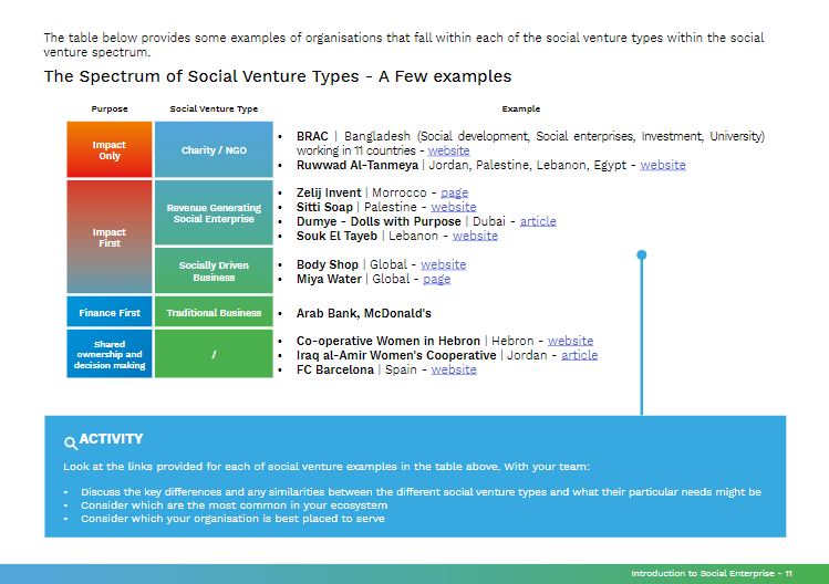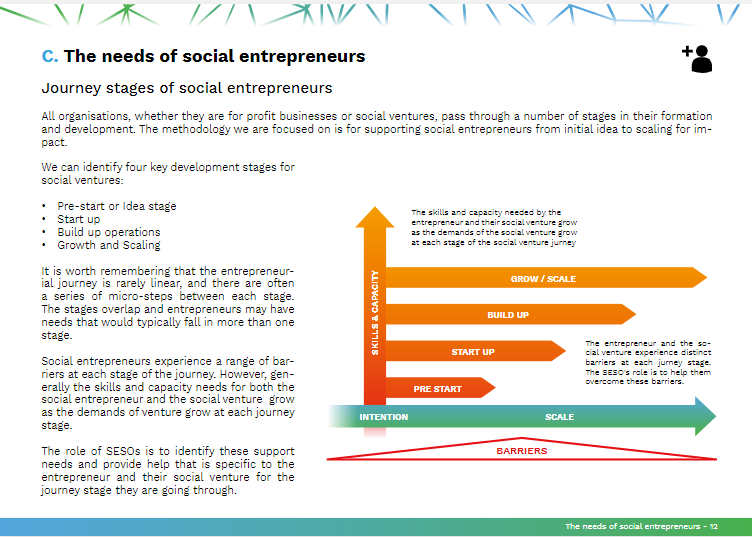 The toolkit is based on many years of experience and evidence of what works for social entrepreneur support. The social entrepreneurs you work with will be at varying stages of readiness, when they approach you for help. Your organisation will also grow and change on your journey to enabling social entrepreneurs to start up and grow. Feel free not to use the toolkit in a linear way, but focus on the information and resources that meet your specific needs at any particular time, adapting it for use to your local context and conditions.