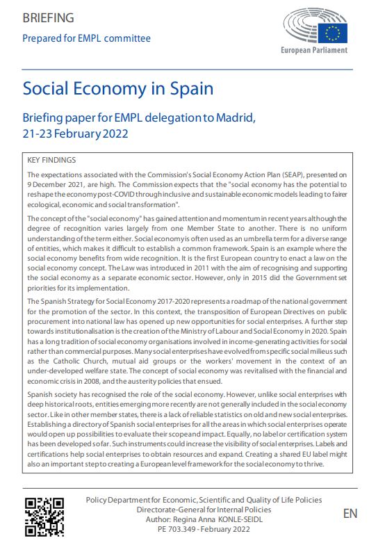 The concept of the “social economy” has gained attention and momentum in recent years although the degree of recognition varies largely from one Member State to another. Spain is an example where the social economy benefits from wide recognition. It is the first European country to enact a law on the social economy concept in 2011. In view of the EMPL delegation visit to Madrid, this briefing elaborates first on the concept applied in the SEAP – presented by the Commission on 9 December 2021 – and on the historical development of the social economy concept across Europe. The second part of the briefing focuses on the social economy’s historical and legal evolution in Spain. Key aspects of the implementation of legal provisions in practice are presented and discussed. Inter alia, we look at factors that either enable or constrain the proper development of the Spanish social economy sector and draw some conclusions for creating a European social economy framework.