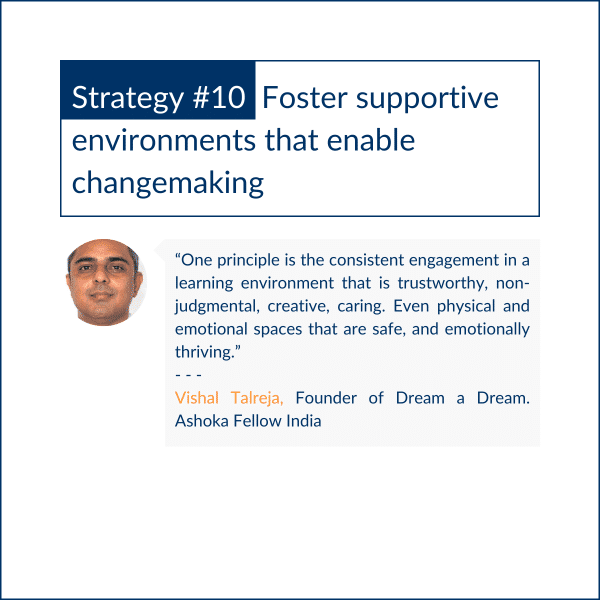Strategy 10: Foster supportive environments that enable changemaking. Fellows invest their energy in the creation of communities where individuals feel psychologically and physically safe, cared for and supported. They do this within the walls of the organizations, but also wherever they convene the broader community in public spaces from classrooms to community squares. In doing so, individuals feel comfortable to share their ideas, work with others, and build something new.