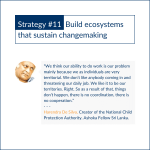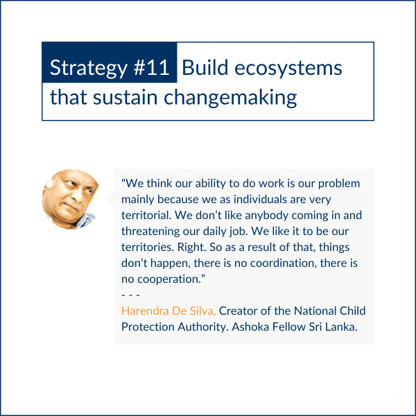 Strategy 11: Build ecosystems that sustain changemaking. Interview data show that Fellows bring together funders, businesses, governments, civil society organizations, media companies, and universities to reduce barriers that blunt agency and prevent individuals from engaging in changemaking. By banding together, they can exponentially increase their potential to address issues that perpetuate systemic inequality.