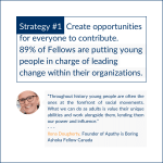Strategy 1: Create opportunities for many individuals to contribute. In addition to creating employment (95% of Ashoka Fellows) and volunteer opportunities (87%), many Fellows recognize that it is time for a fundamental shift especially in the role of young people. 89% of Fellows are putting young people in charge of leading change within their organizations.