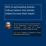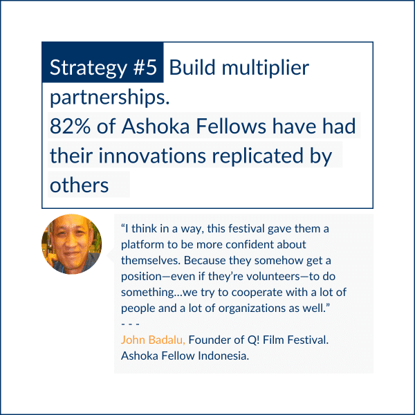 Strategy 5: Build multiplier partnerships. Ashoka Fellows build partnerships to generate solutions, impact, and changemakers. They work with others toward a shared vision. They often relinquish control and ownership of their ideas to see them spread as far as possible: 82% of Ashoka Fellows have had their innovations replicated by others (through strategic partnerships, open sourcing or licensing, among other methods). 61% replicated within their country, and 42% at an international level.