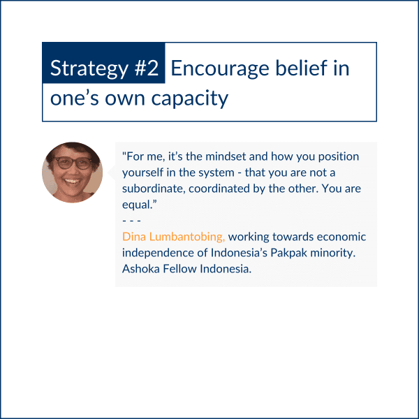 Strategy 2: Encourage individuals to believe in their own capacity. By encouraging problem-solving on even a small scale, Ashoka Fellows expand others’ sense of agency. Giving a person the opportunity to take action and make a difference–no matter how small–sets in motion a long-term commitment to changemaking.