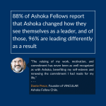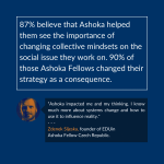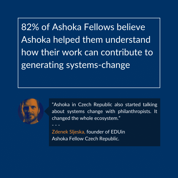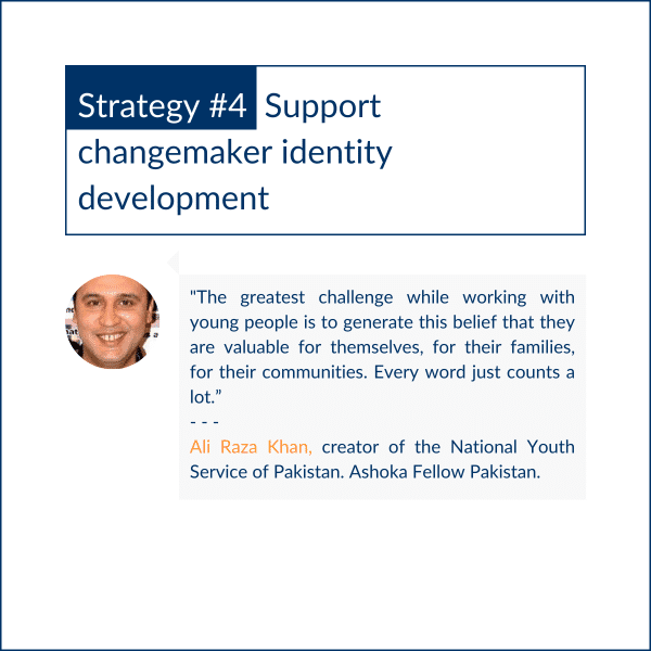 Strategy 4: Support changemaker identity development. Ashoka Fellows identity as changemakers sustains their commitment to systems-change work. This identity benefits their communities and professional endeavors as well as their personal development and quality of life. Wanting this for those around them, Ashoka Fellows help others to develop changemaker identities.