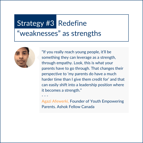 Strategy 3: Redefine “weaknesses” as strengths. Interview data showed that Ashoka Fellows take stock of people’s skills and invite them to put these to good use. Further, they look at what broader society may perceive as weakness and find strength, leveraging diverse experiences or skills to drive positive change.