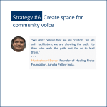 Strategy 6: Create space for the community’s voice. Ashoka Fellows see community members not as beneficiaries, but as experts and decision-makers. As such, they create space for community members to develop solutions and voice their plans for action. They present ideas and ask for input from a range of stakeholders or invite others to partner in implementing solutions.