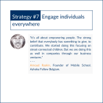 Strategy 7: Engage individuals everywhere. Interview data show that Fellows strategically target community members who are beyond the inner circle of allies. By targeting “unlikely allies,” Fellows can often engage those who may not normally encounter a specific social issue, but who can meaningfully contribute to positive social change.