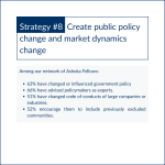 Strategy 8: Shift policies and market systems. Many institutions either by design or inadvertently prevent large portions of society from reaching their full potential. Ashoka Fellows shift systems and restructure institutions to operate in service of the collective good and provide many more people the freedom and support to contribute. They do this by changing policies of large companies or industries (51%), encouraging them to include previously excluded communities (52%), or creating value for a product or service where it didn’t exist before (51%). At the legislative level, 63% of Ashoka Fellows changed or influenced government policy, while 66% have advised policymakers as experts.