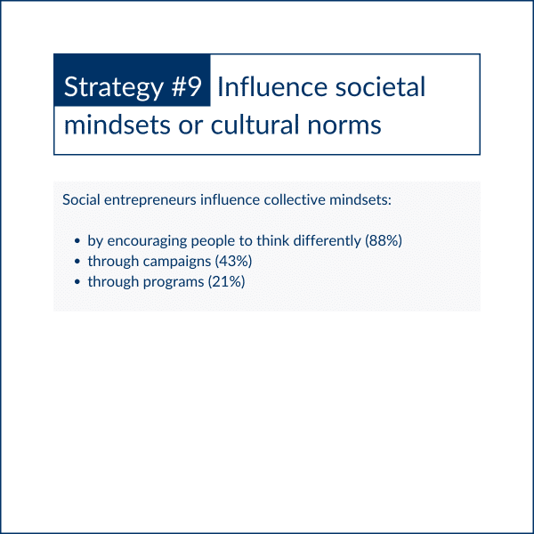 Strategy 9: Influence societal mindsets or cultural norms. By influencing societal mindsets and cultural norms, they help others see and act in accordance with social changes that benefit all. Fellows do this by encouraging people to think differently (88%), through campaigns (43%), or through programs (21%).